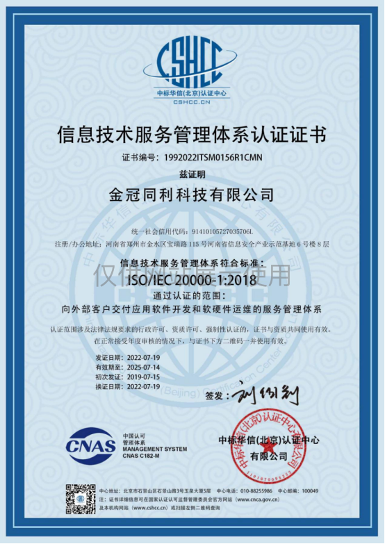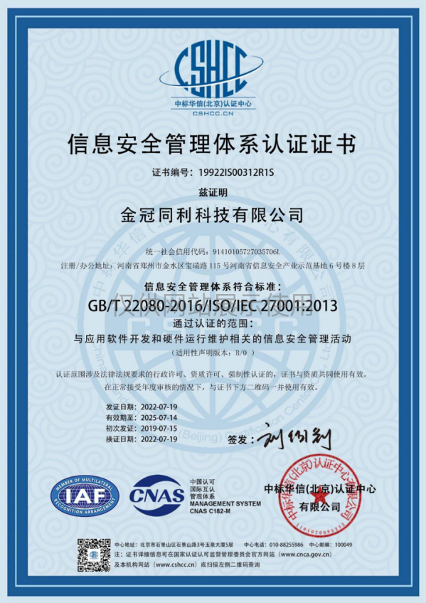 金冠同利科技有限公司,成立于2001年,注册资金5000万,是河南省知名的IT系统综合服务商。金冠专注于金融行业、医疗行业、烟草行业、企业信息化建设19年,一直致力于为客户提供行业信息化整体解决方案、为多家银行、保险、证券、高端制造企业、行业高端咨询服务、行业软件定制研发服务。 公司信息化整体解决方案涵盖大数据中心、数据中心容灾、高性能平台建设、私有云、业务连续性咨询及平台服务;IT综合运维服务和研发业务涉及多个行业多个领域,以客户满意为目标,致力于提供优质服务、创造不凡价值。 金冠同利目前在职人员120余人,技术团队占80%,为多家银行、保险、证券、高端制造企业、上百家医院提供着优质的产品和服务,客户覆盖河南、山西、河北等省份。我们将继续努力前行,立志把服务的客户区域范围推向全国。为服务的客户提供更高的价值,与客户一起成长,共同进步。