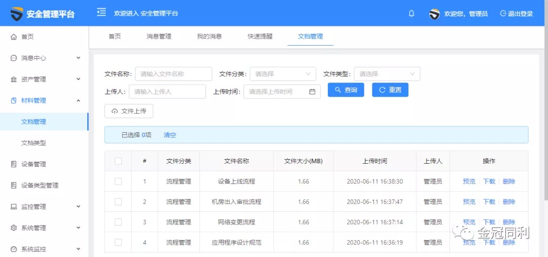 ②平台设计了灵活强大的文档管理模块,方便用户对安全制度文档、日常运维文档、安全政策文档等文档的管理。实现在线文档查看、搜索、下载等功能。
