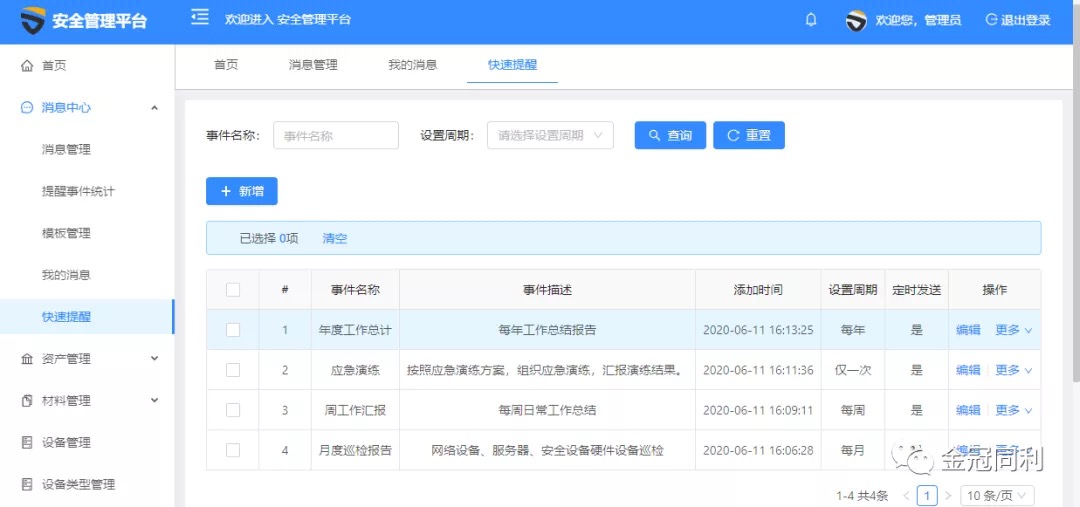 告警消息:提醒、展示监控到的设备告警消息,提醒安全管理平台用户及时对设备告警进行处置;消息中心内置消息模板,通过内置的消息模板可以做到周期性的任务提醒,周期性的扫描提醒等。满足客户的多元化需求。
